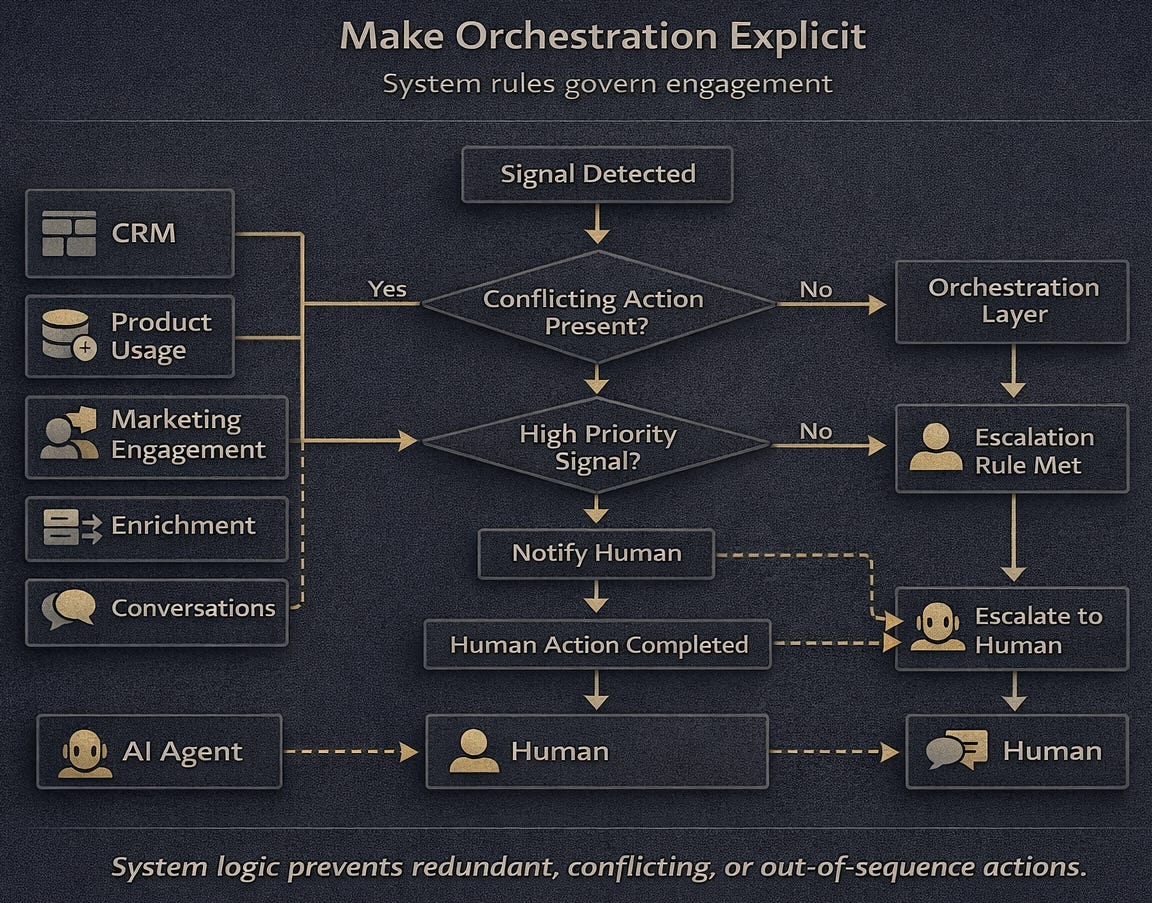 Define what actions should never happen simultaneously, when agents escalate to humans, when humans hand control back to agents, and which signals override all others. Treat orchestration as production logic, not campaign setup.