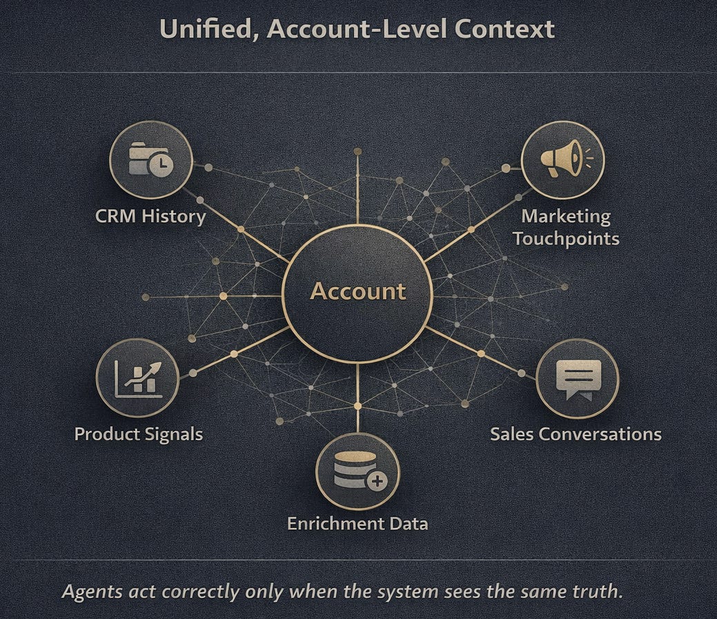 This context must unify product usage, CRM history, marketing engagement, firmographic attributes, and prior conversations into one shared representation of the buyer and the account. If marketing, sales, product, and customer success each operate from different versions of the truth, agents cannot reconcile that disagreement. They will simply pick one source of context and act on it.
