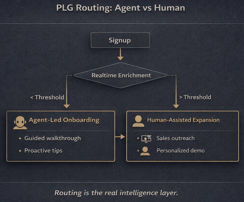 In a weak system, an agent sends generic onboarding, sales reaches out days later without context, and marketing continues a nurture sequence that ignores product usage. In a strong system, real-time enrichment occurs at signup, usage signals are evaluated immediately, and the system decides whether the account should remain agent-led or transition to human involvement.