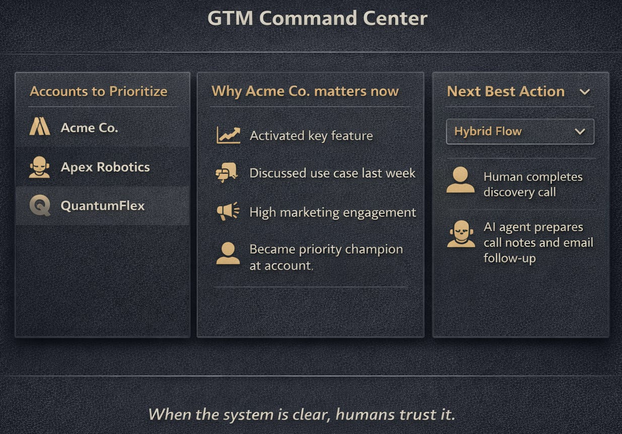A proper activation surface tells the operator which account matters now, why it matters, what action should be taken next, and whether that action is best handled by a human, an agent, or a hybrid flow. When reps are still acting as the integration layer, agents are not creating leverage. They are creating cognitive load.