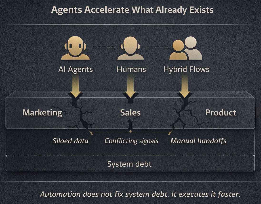 Agents do not create leverage on their own. They simply act on top of the systems that already exist across sales, marketing, product, and RevOps. When those systems are fragmented, slow, or misaligned, agents do not fix the problem. They execute it faster and at scale.