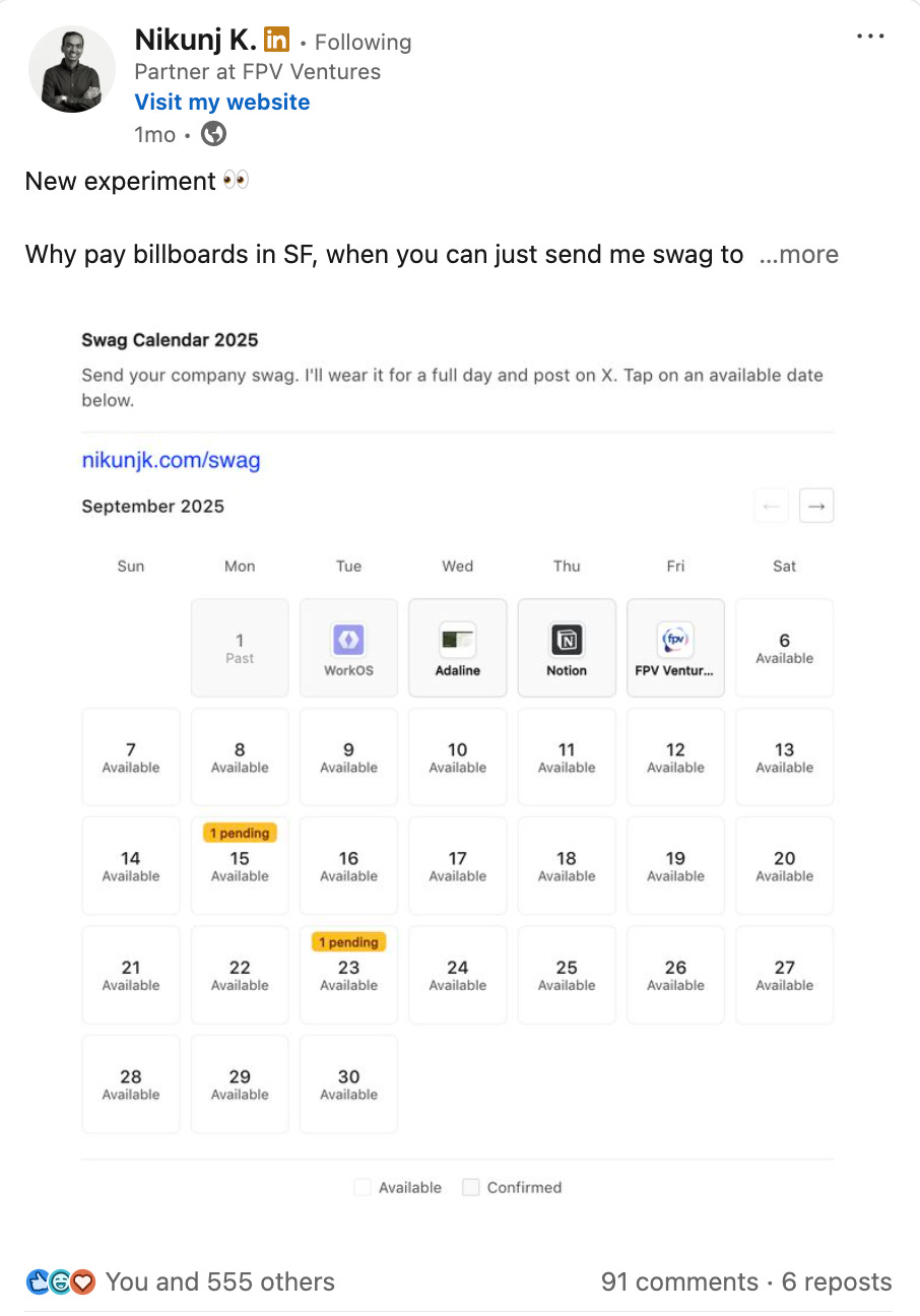 “Why pay SF billboards when you can just send me your startup’s swag? I walk 7 miles a day.”