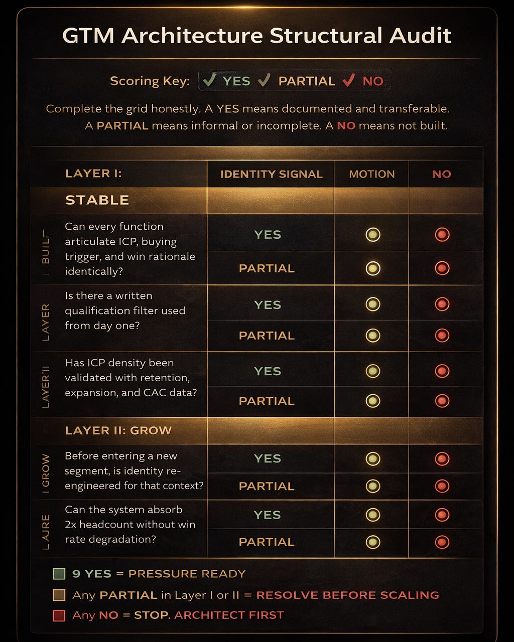 The framework described in this essay is not intended to function only as a conceptual model. It is designed to be applied. The instrument for applying it is the nine-block Structural Audit Grid below. Each cell in the grid represents the intersection of a GTM Architecture layer (Build, Operate, Grow) and a diagnostic dimension (Identity Signal, Motion Signal, Pressure Readiness), and each intersection contains a governing question designed to surface whether that dimension has been formally engineered or is still operating on the basis of institutional informality.