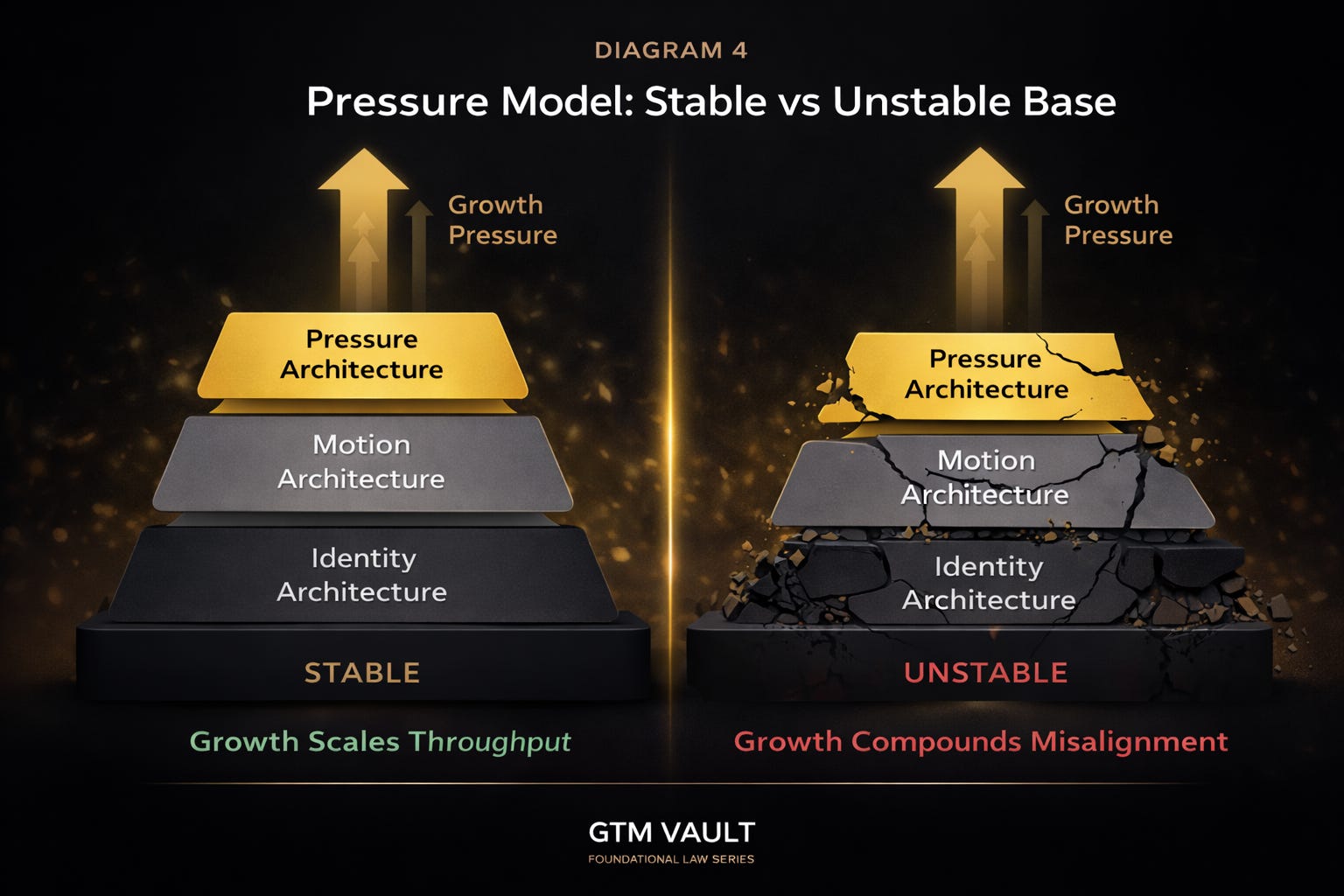 This is the central principle of Pressure Architecture: growth is the final applied force, not the starting point. The sequencing is not a bureaucratic constraint. It is the operational expression of how structural systems actually behave under load.