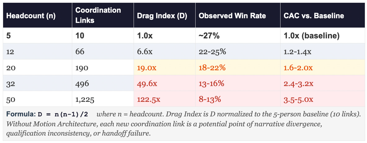 The table below models what this relationship looks like empirically across the case studies described in this essay and the broader pattern observed across revenue organizations that scaled before Motion Architecture was formalized. The Drag Index normalizes coordination complexity against the 5-person baseline, and the win rate and CAC columns reflect the observed range of outcomes across organizations at each headcount threshold operating without motion governance.