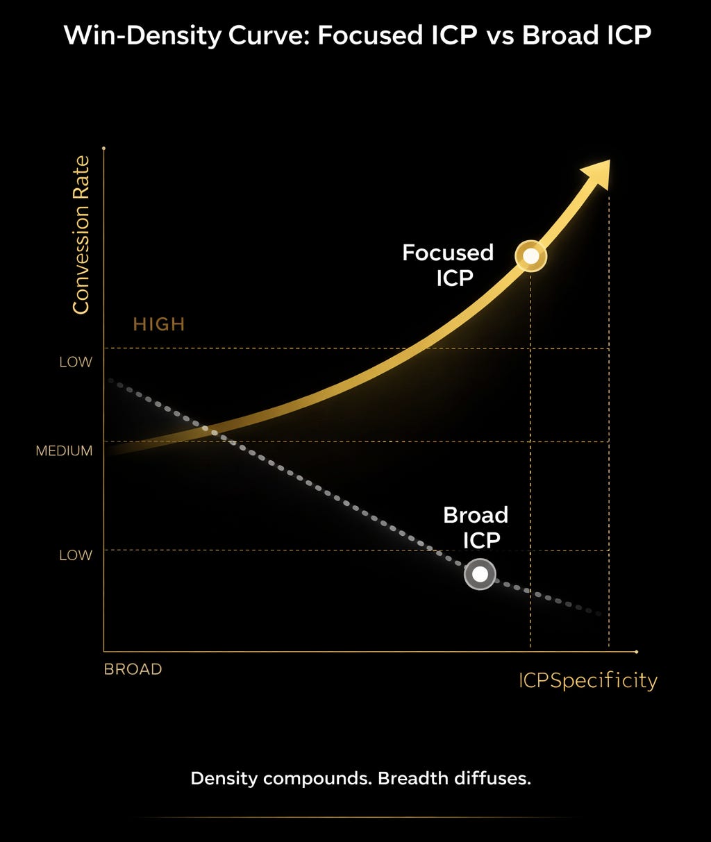 The company was scaling breadth instead of density. Once ICP prioritization was formally codified around the dominant vertical, positioning was rewritten in that segment’s operational language, packaging was simplified around the primary use case, and pricing was aligned to the activation milestones that mattered specifically to that buyer. Win rates increased by double digits and CAC declined within two quarters, with no new channels introduced, no additional headcount added, and no tactical changes made to the acquisition motion whatsoever. Identity was engineered. The system responded accordingly.