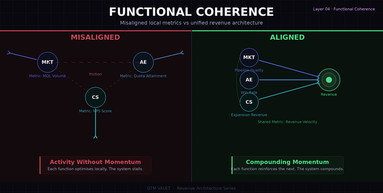 Marketing, sales, and customer success each have local metrics. When those metrics pull in different directions, the system produces activity without momentum.