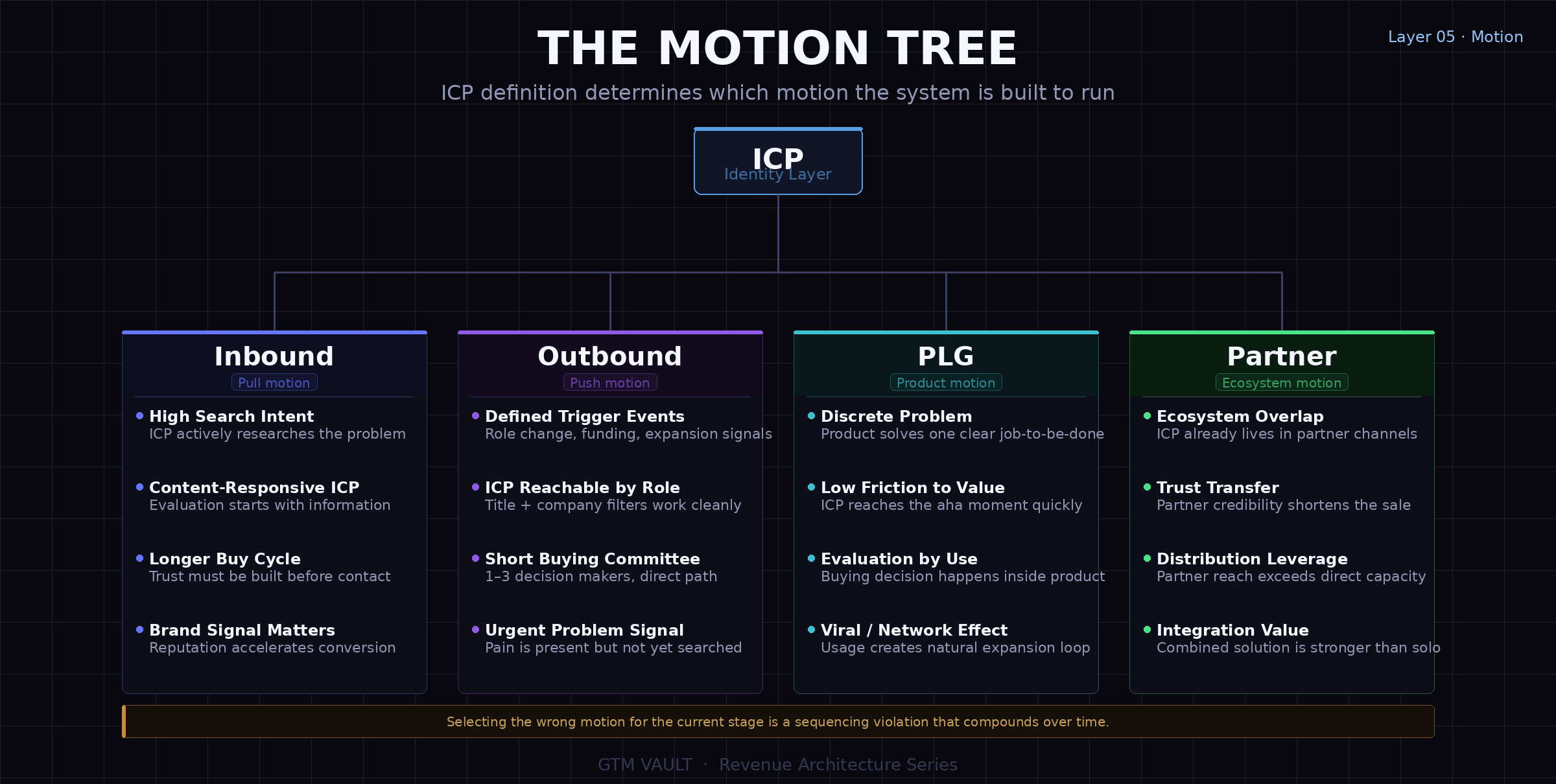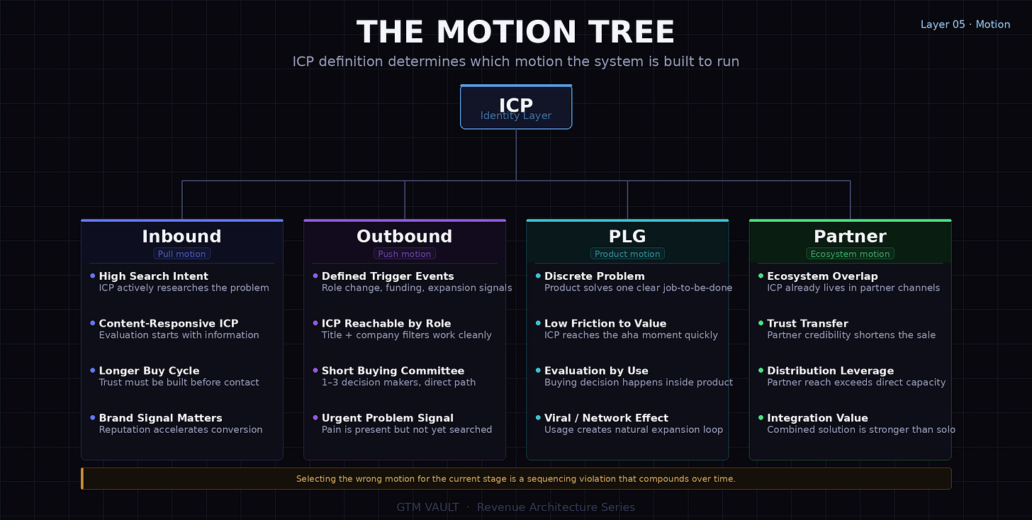 With identity defined and the system sequenced correctly, a motion is selected. Inbound, outbound, PLG, or partner. Each requires a different structural foundation.